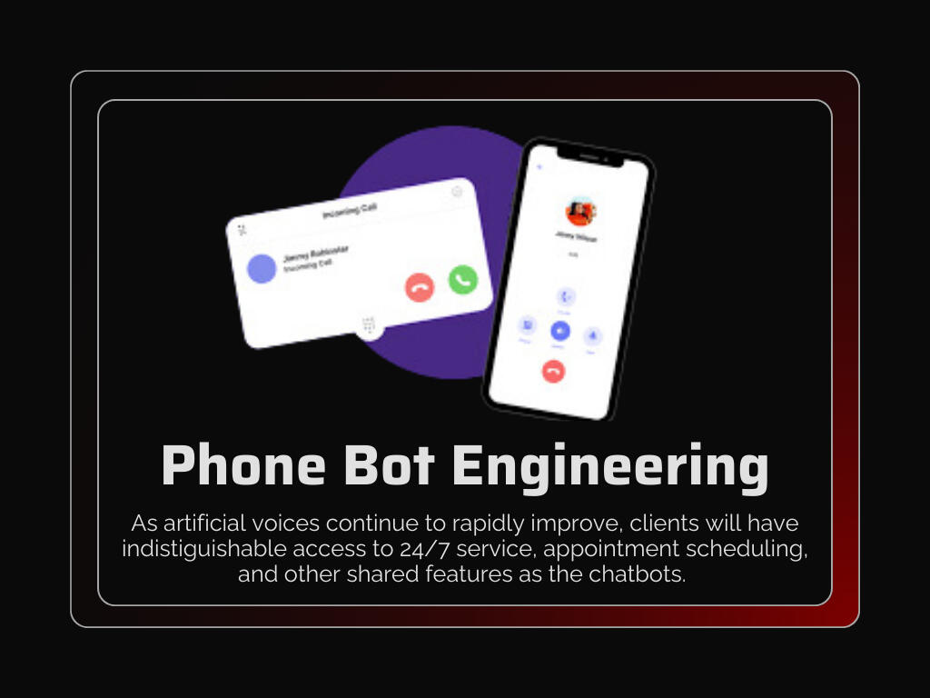 As technology advances, artifical voices advance as well. With these voices, we create phone bots that handle customer interactions efficiently and professionally. Much like the website chatbots, this can involve automatic scheduling, follow-ups, lead qualificaiton, etc.