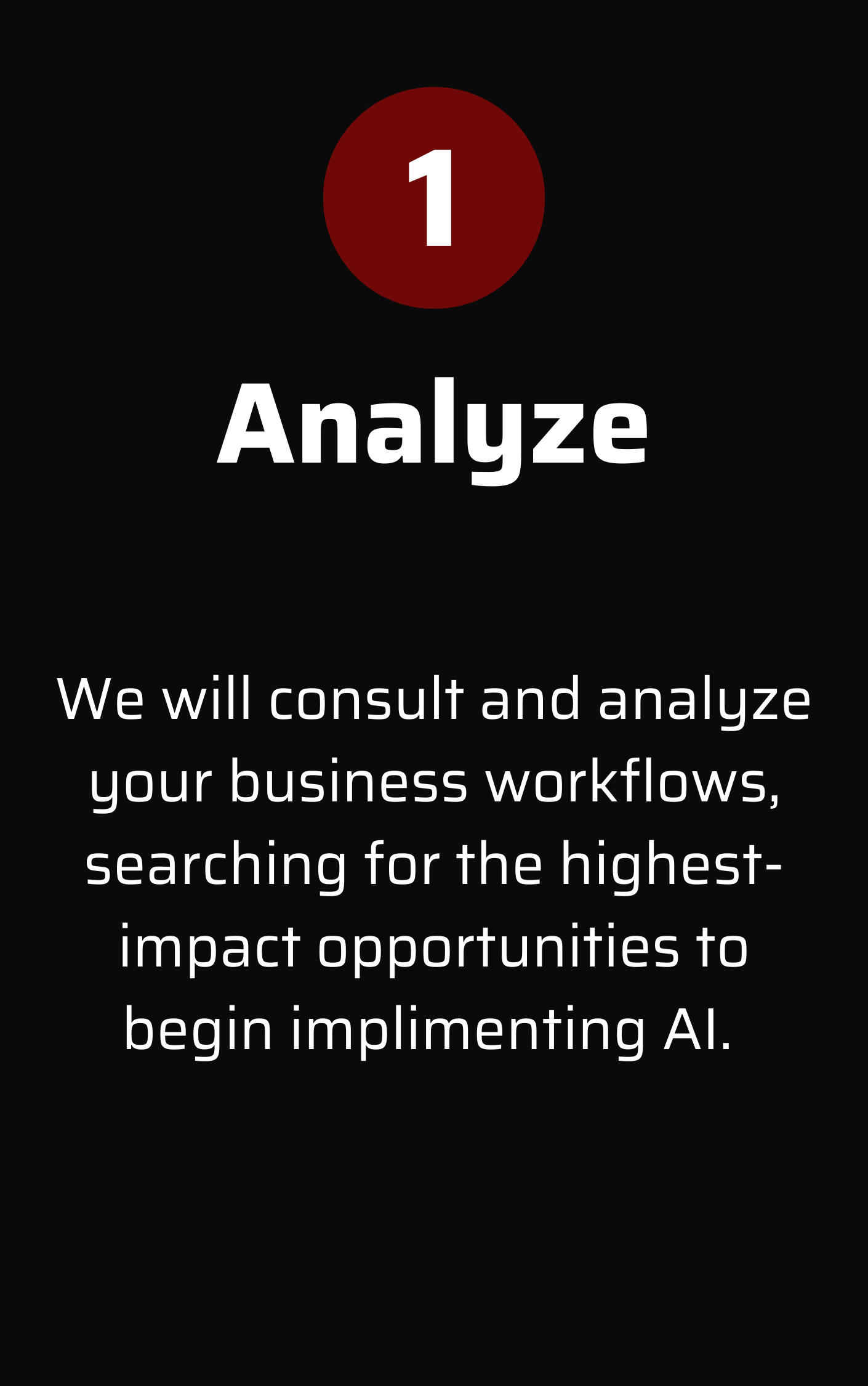 We will consult and analyze your business workflows, searching for the highest-impact opportunities to begin implimenting AI.